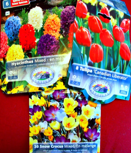 Do any of you put things away and then completely forget about them? A few months ago when I bought these, someone told me that it was probably still too warm to plant them. I put them away. Thanksgiving came. Then Christmas took up all of my brain space. One day, while looking at Helena's Hem & Tradgard blog http://helenashemotradgard.blogspot.com/ she had the most beautiful bulbs blooming in pots inside her home. It was like an alarm went off in my brain--MY FLOWER BULBS!. I took them out of where I had stored them, which was covered with Christmas stuff waiting to be put away. Some were starting to sprout a little. One had rotted. It was really cold that day. More days went by. My husband and I came down with the cold/flu. It continued to be windy and cold. New Year's Eve had come and gone, the bulbs were still in their plastic packages. Finally, three days ago, it was about forty degrees outside, the snow had melted, the ground was damp and easy to shovel. Come heck or high water, those bulbs had to be planted. My bad knees won't allow me to use a shovel. My husband was sweet and dug the holes for my big red tulips, colorful hyacinths, and one bag of crocus. I was able to use the garden trowel to dig an area for another bag of crocus. Instead of planting in individual holes, he dug various big holes and I put several bulbs in each hole. I hope the bulbs will be happy and bloom where they are planted. I will be checking for little sprouts near the end of February.